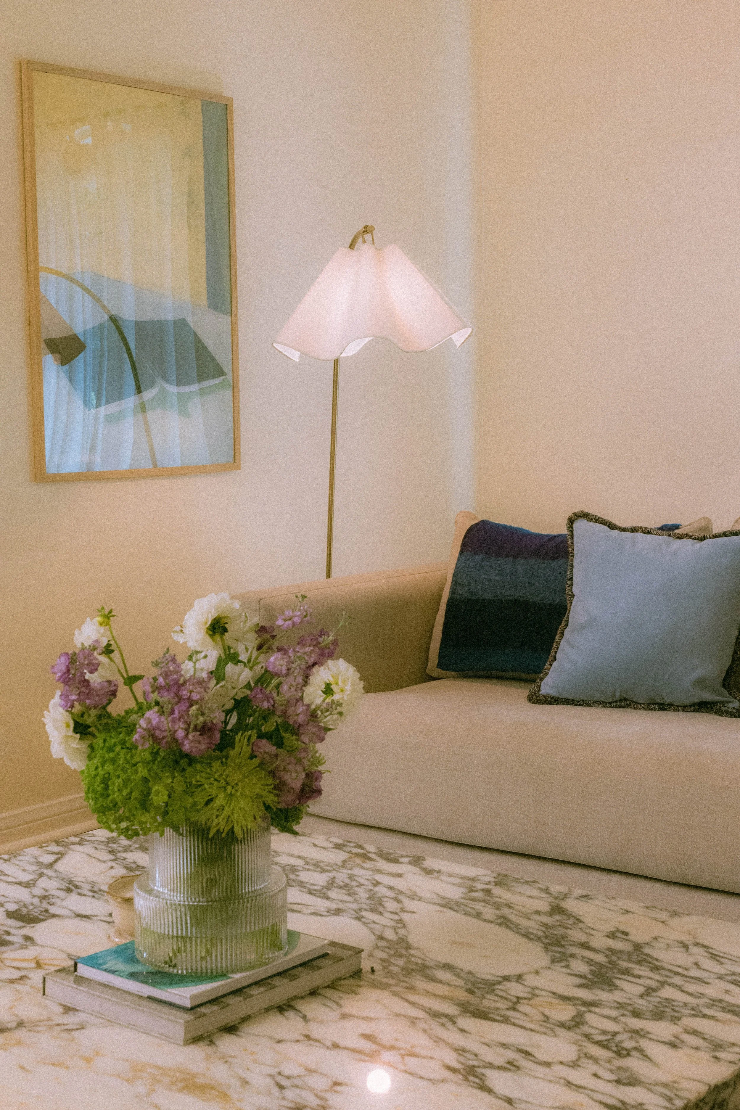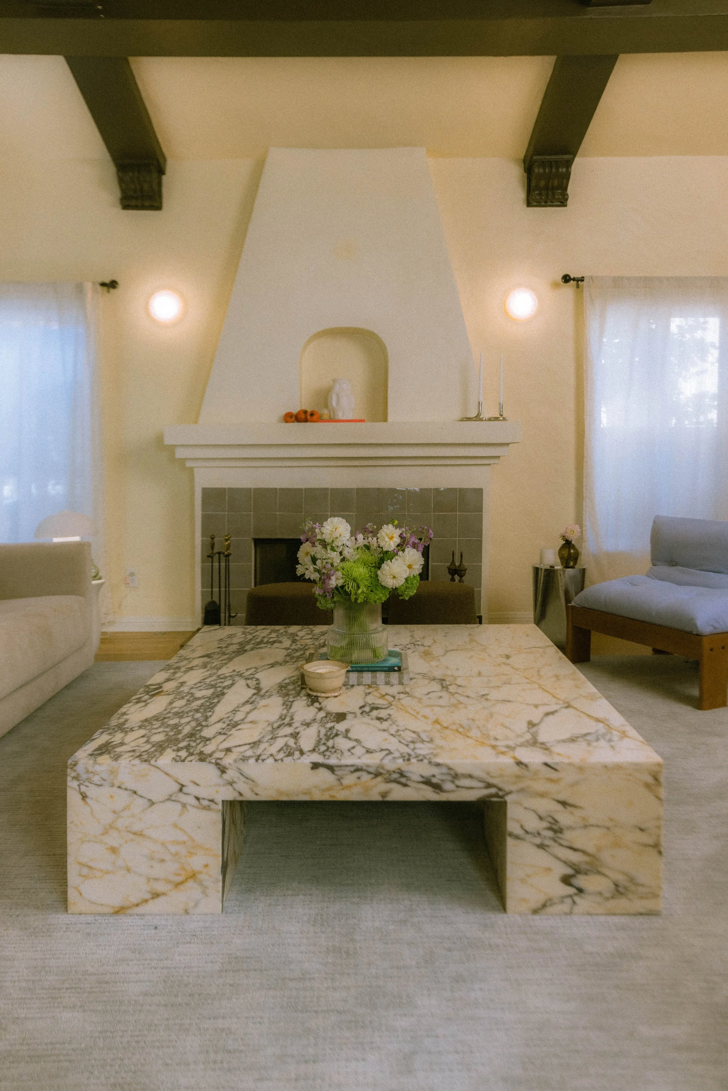 The goal of this design was to add cultural nods to Mexico City and Italy while making it a perfect space for entertaining. We created a layout focused on living; an arrangement centered around a large coffee table to encourage conversation and relaxation. When sourcing furniture, we focused on items that had artistic integrity. A bold, extra-large square Calacatta marble coffee table was the perfect nod to the couple’s love of Italian modern design. The blue-toned rug and periwinkle chairs added a pop of color. And the sideboard gave the space that hand-carved feel.